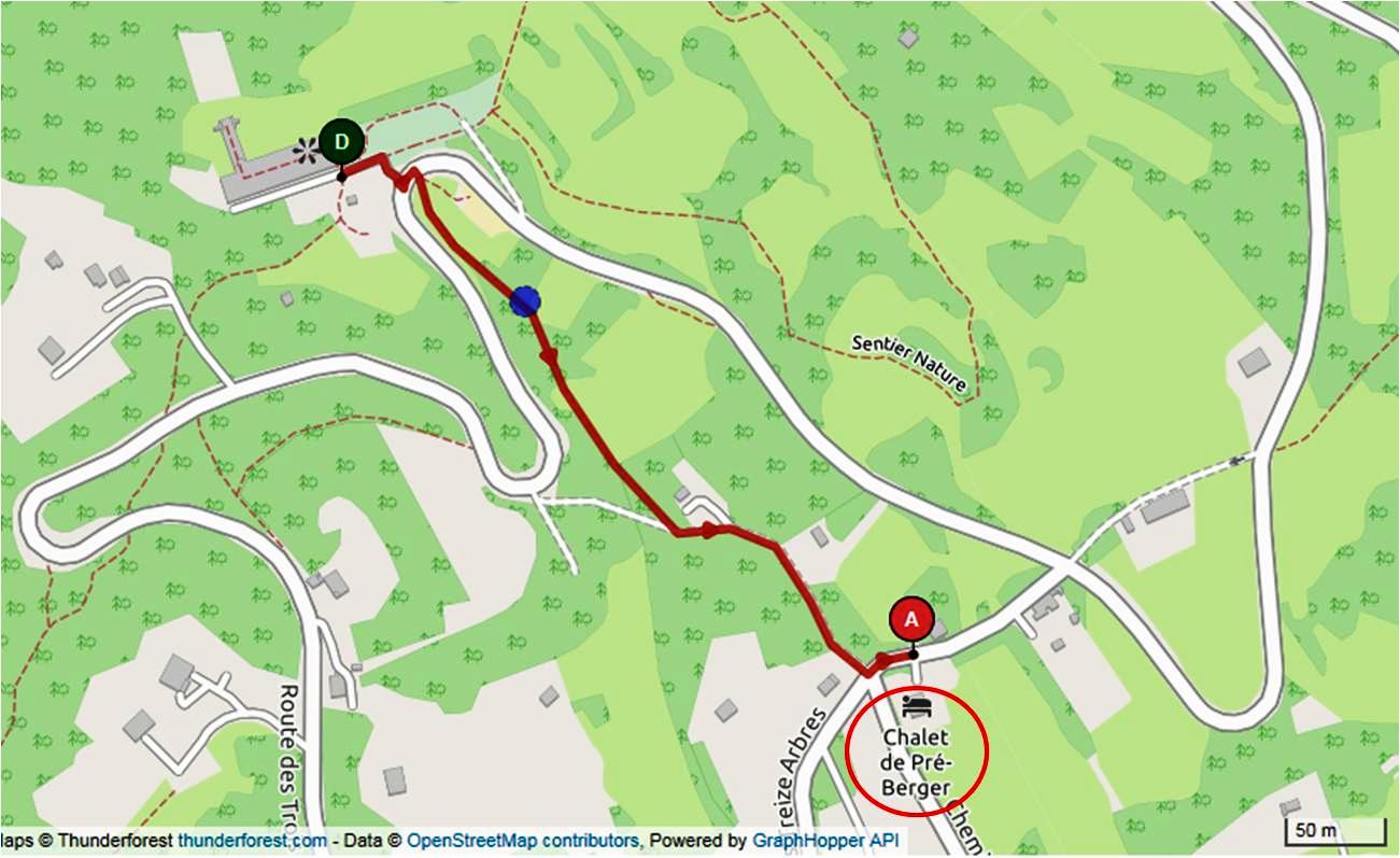 500 mètres après la gare d'arrivée du téléphérique, vous verrez sur la droite un chemin avec un panneau portant 3 indications (photo), dont une de couleur jaune indiquant Pré-Berger. Prendre ce chemin et 50 mètres après sur la gauche, vous verrez le chalet avec le parking juste avant (photo).